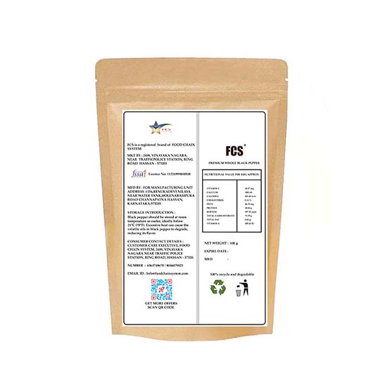 Sourced from the black pepper plant, FCS Black Pepper is an aromatic black pepper spice that is a must-have in every kitchen. Known for its bold, pungent flavor and rich aroma, it enhances the taste of soups, curries, salads, and marinades. Grown on the black pepper tree, it is packed with antioxidants and essential nutrients that support digestion and overall wellness.